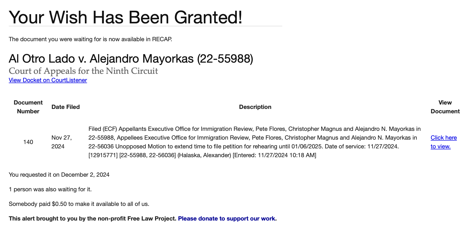 The most-wanted documents are shown on a leaderboard ranked by how many users have requested a particular document and how many views their corresponding docket has received. After a document is requested, we check PACER to see if it is available for purchase. Unavailable documents are ranked at the bottom of the list; if they later become available, they will be sorted with other open requests. As requests are fulfilled, they are removed from the leaderboard.